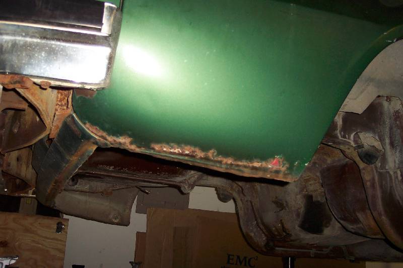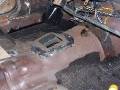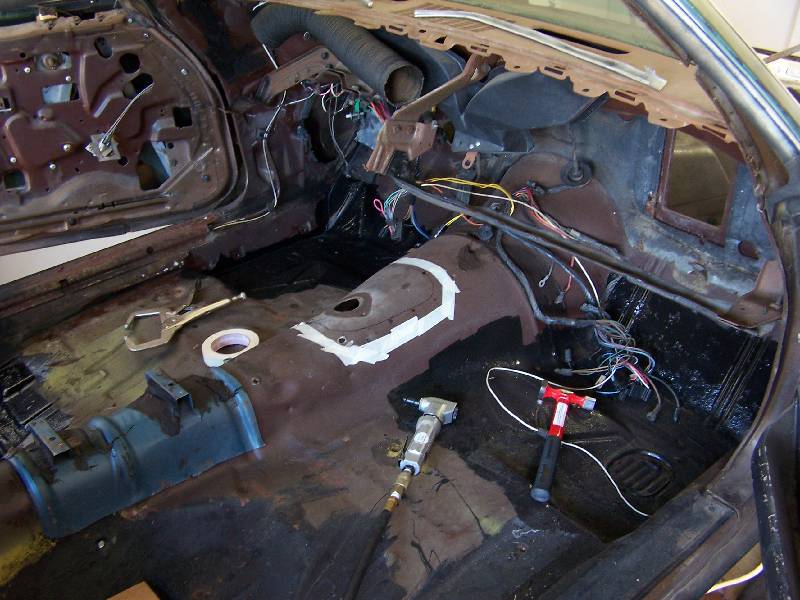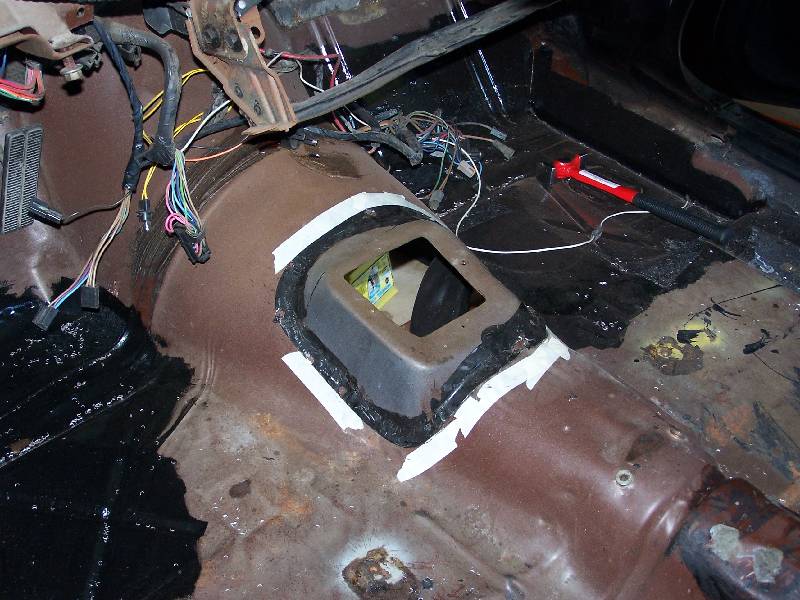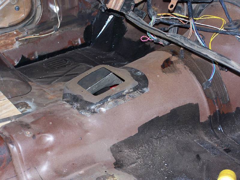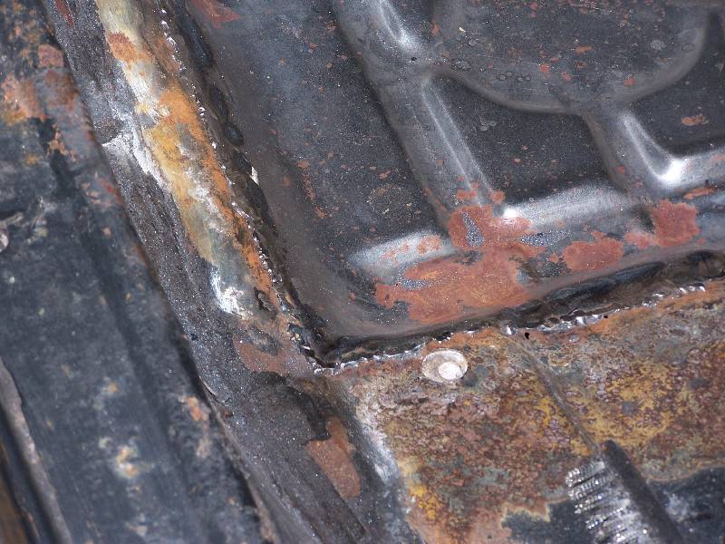 It looks like the rear glass leaks because someone has at one time tried to re-seal it form the outside with silicone. The passenger side rear quarter has rusted through at the very bottom. They also tried to use something (seam sealer?) to paint over the rust in the rear floorboard. It continued to rust through and needs replacing. They also removed the console brackets from the floorpan.