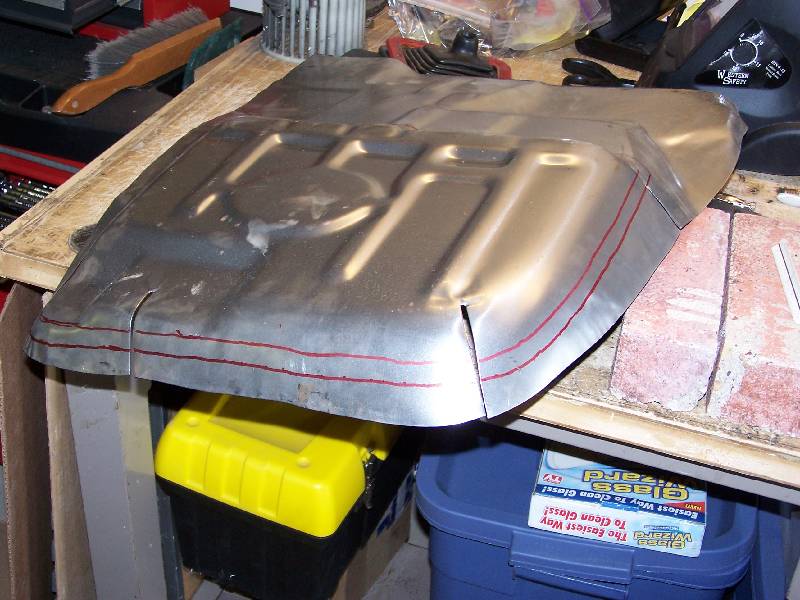 Here you can see what the rust looked like in the original floorpan. I laid out a line with masking tape, and used an air cut-off tool to remove the damage. Be aware of any supports that you don't want to cut through, like in the third picture. I then took the new pan, which I got from CARS, Inc., and laid it into place. I weighted it down and traced a line with a Sharpie. On the bench, I traced another line a half inch "up" for the overlap, as in the fifth picture.