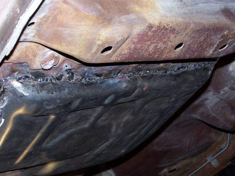 This was my first shot at MIG welding, and I did well enough to get the job done. Not real pretty, but the pan is in. I found that sticking two peices of metal together and welding are two different things, although once I figured out that the wire feed was not working right and fixed it, it went a WHOLE lot better. I took a 4 " grinder and knocked the welds down a bit for looks. I had the car up on Rhino ramps, but still, welding on your back under the car is a P-A-I-N.
