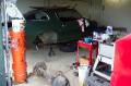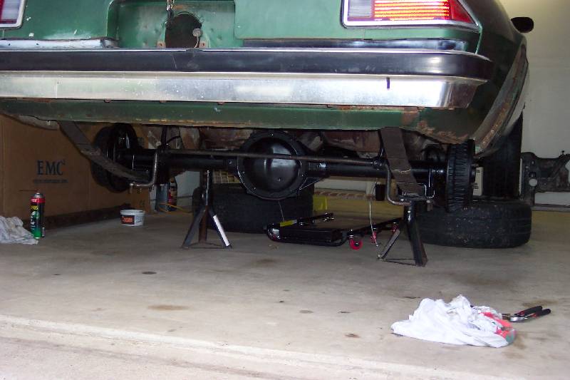 The rear suspension rebuild involved pulling the old rear out, cleaning it up and painting it satin black. The rear has had a 3.08 Posi installed at one time, despite the rear cover stating that it is a 3.73. The stock 5 leaf springs were rated 90 lbs per inch, and the replacement 4 leaf springs were calculated to rate at 125 lbs per inch. As you can see in the fourth picture, the 4 leafs have much less arch than the stock ones. I don't know who manufactures them; I bought them from a guy parting out his '79 Nova project. They had the number 80-335-252 stenciled in yellow on them. If you know what this means, please drop me an e-mail! I added new Moog rubber bushings, front and rear eyes, along with new rubber spring pads for the install.