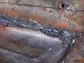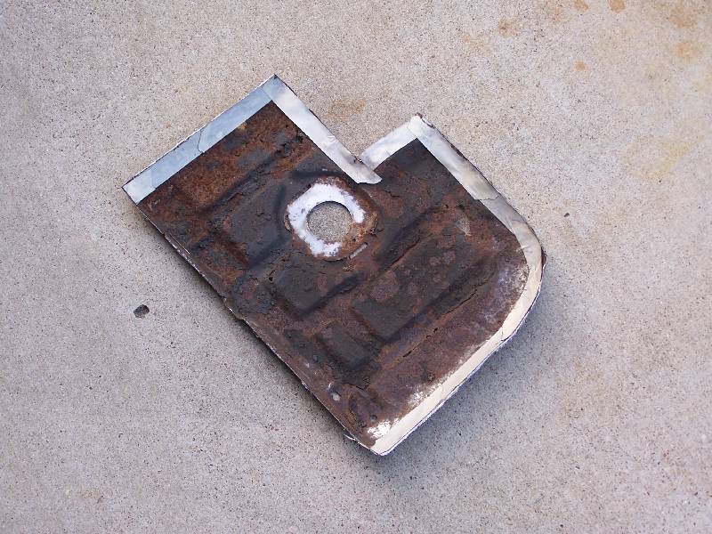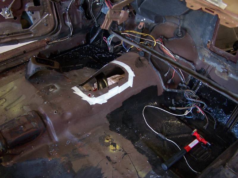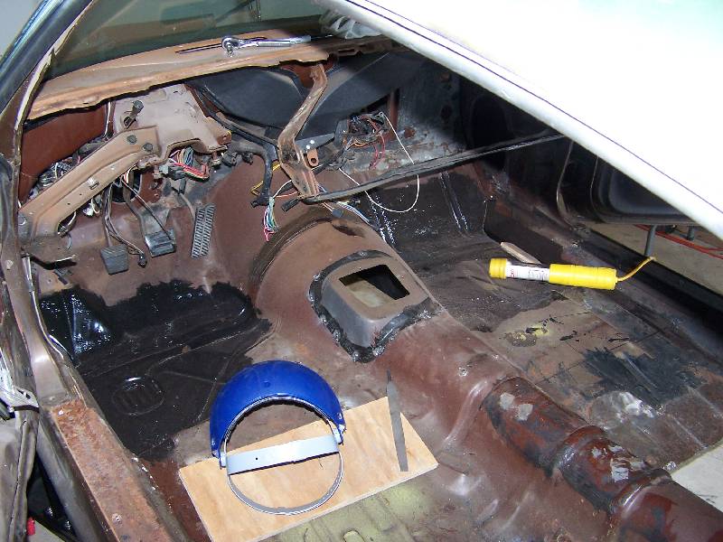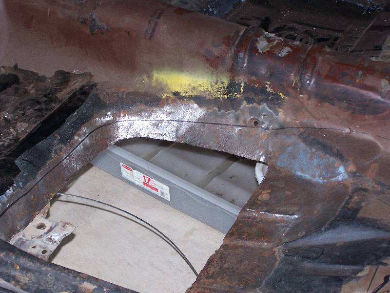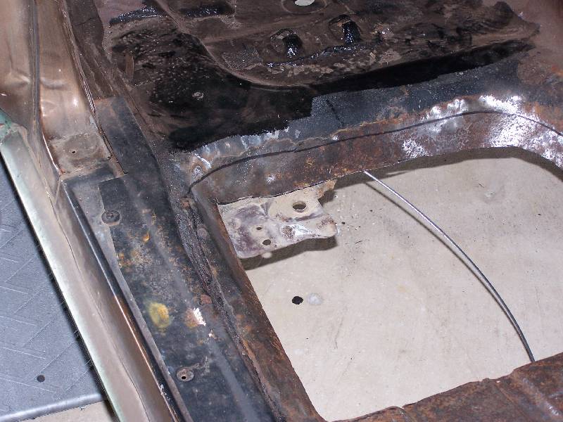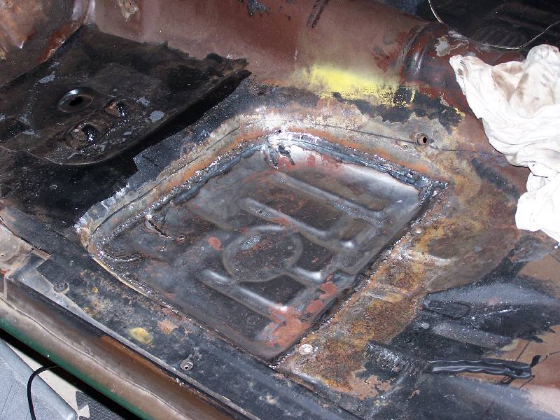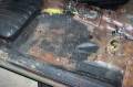 It looks like the rear glass leaks because someone has at one time tried to re-seal it form the outside with silicone. The passenger side rear quarter has rusted through at the very bottom. They also tried to use something (seam sealer?) to paint over the rust in the rear floorboard. It continued to rust through and needs replacing. They also removed the console brackets from the floorpan.