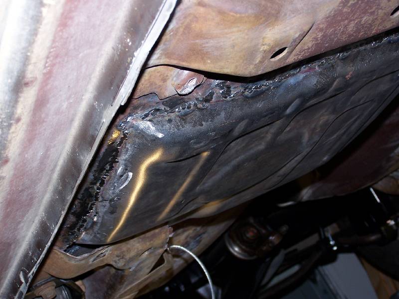 This was my first shot at MIG welding, and I did well enough to get the job done. Not real pretty, but the pan is in. I found that sticking two peices of metal together and welding are two different things, although once I figured out that the wire feed was not working right and fixed it, it went a WHOLE lot better. I took a 4 " grinder and knocked the welds down a bit for looks. I had the car up on Rhino ramps, but still, welding on your back under the car is a P-A-I-N.