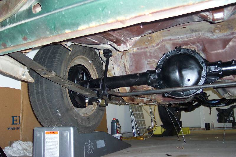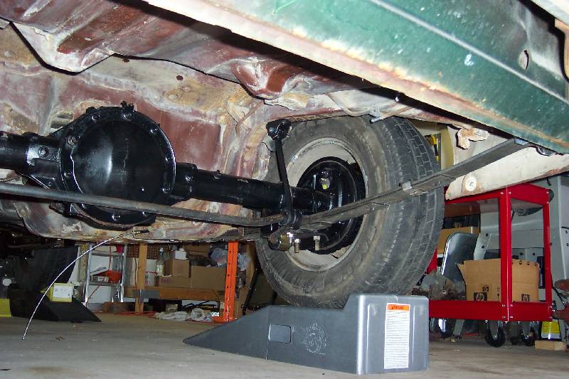 The rear suspension rebuild involved pulling the old rear out, cleaning it up and painting it satin black. The rear has had a 3.08 Posi installed at one time, despite the rear cover stating that it is a 3.73. The stock 5 leaf springs were rated 90 lbs per inch, and the replacement 4 leaf springs were calculated to rate at 125 lbs per inch. As you can see in the fourth picture, the 4 leafs have much less arch than the stock ones. I don't know who manufactures them; I bought them from a guy parting out his '79 Nova project. They had the number 80-335-252 stenciled in yellow on them. If you know what this means, please drop me an e-mail! I added new Moog rubber bushings, front and rear eyes, along with new rubber spring pads for the install.